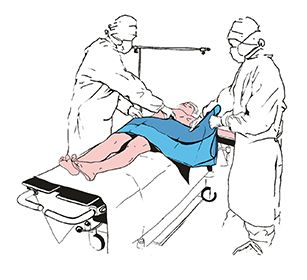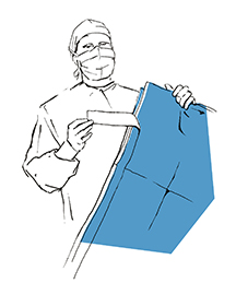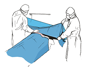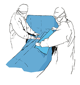 Upevníme rúšku na telo pacienta a roztiahneme ju v smere šípok, čím vymedzíme spodnú hranicu operačného poľa. Zvyšnú časť rúška roztiahneme na nohy.
