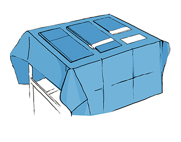 Po otvorení obalu položíme rúšku s obsahom na pomocný stôl. Vonkajšou rúškou prikryjeme stôl. Rozložíme obsah súpravy na stole, venujeme pozornosť piktogramom na rúškach označujúcich miesto ich použitia.